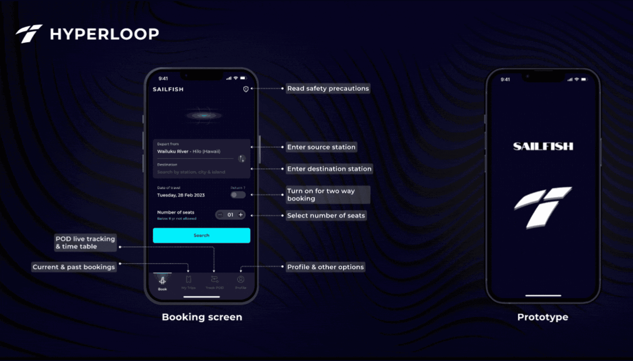 Create an app to book and manage tickets for Hawaii's SailFish Hyperloop, connecting islands via a dual-lane Hyperpool.